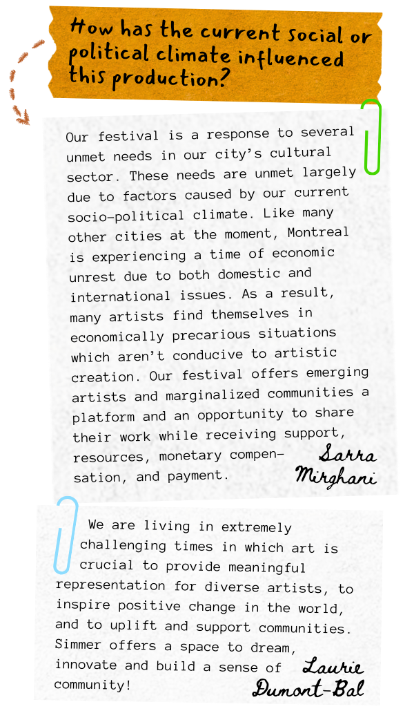 Our festival is a response to several unmet needs in our city’s cultural sector. These needs are unmet largely due to factors caused by our current socio-political climate. Like many other cities at the moment, Montreal is experiencing a time of economic unrest due to both domestic and international issues. As a result, many artists find themselves in economically precarious situations which aren’t conducive to artistic creation. Our festival offers emerging artists and marginalized communities a platform and an opportunity to share their work while receiving support, resources, monetary compensation, and payment.