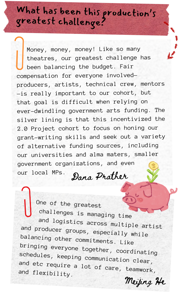 Money, money, money! Like so many theatres, our greatest challenge has been balancing the budget. Fair compensation for everyone involved—producers, artists, technical crew, mentors—is really important to our cohort, but that goal is difficult when relying on ever-dwindling government arts funding. The silver lining is that this incentivized the 2.0 Project cohort to focus on honing our grant-writing skills and seek out a variety of alternative funding sources, including our universities and alma maters, smaller government organizations, and even our local MPs.