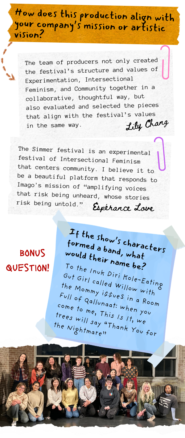Answers provided by: Imago Theatre’s 2.0 Project Cohort and producers of Simmer Fest - Laurie Dumont-Bal, Lily Chang, Charly Cartier, Espérance Love, Meijing He, Lewis Badun, Sarra Mirghani, Dana Prather