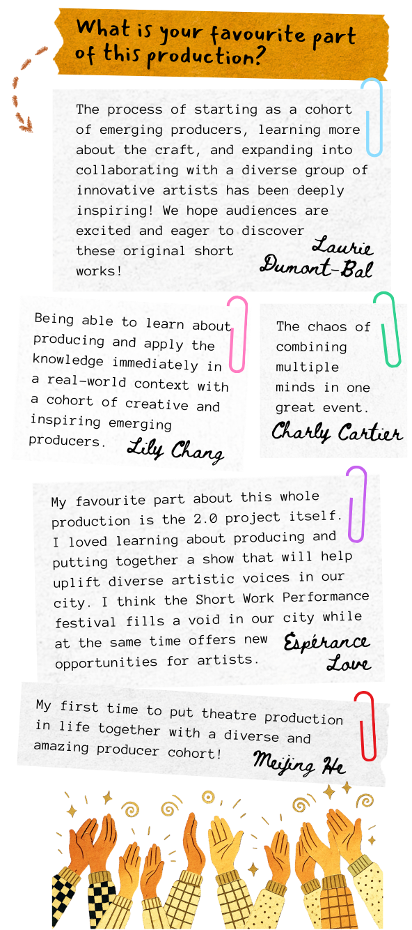 My favourite part about this whole production is the 2.0 project itself. I loved learning about producing and putting together a show that will help uplift diverse artistic voices in our city. I think the Short Work Performance festival fills a void in our city while at the same time offers new opportunities for artists